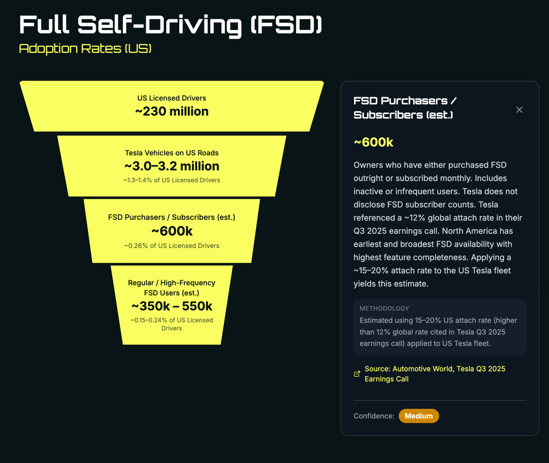 Back in June, I bought a Model Y. Since then, I have put on about 9,000 miles, of which I’d estimate 90-95% were in FSD (since they introduced tracking in FSD 14, I’ve got over 2,000 miles with 96% Tesla at the wheel). When I ask friends what percentage they think it drives, they guess 30%, imagining it only works on highways. This perception gap is the root of the entire problem. The technology exists. The capability is here. But without visibility, there’s no snowball. Check out the most recent data from Tesla on the penetration in the United States, for example. Despite this technology being nothing short of mind-blowing, only around 12% of the Tesla user base uses FSD regularly. What this means is that only about 1 in 1,000 Americans has ever experienced Tesla FSD. We have built this interactive funnel to give you a sense of FSD’s penetration in the US, which you can play with.