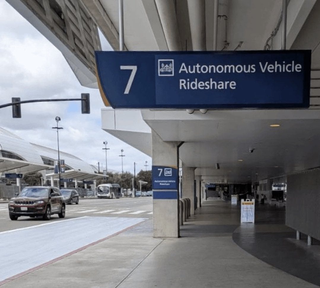 In a last bit of Waymo news, San Jose Airport has put up its autonomous vehicle rideshare signage. As shown in the image below, an advantage of being a first mover is that public signage iconography intended to cover a wide range of services ends up being designed to reflect your hardware.