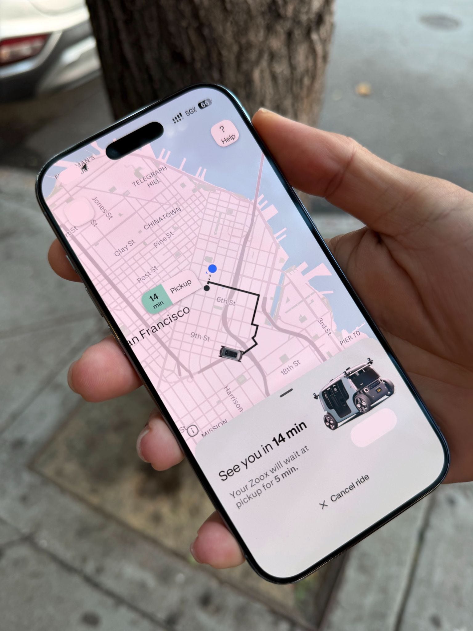 Early testers who had filled out surveys are now starting to get invited to the San Francisco service area via the Zoox app. The service area is limited to a small geofence in the South of Market area of San Francisco, and hailing, while free for now, is time-gated.